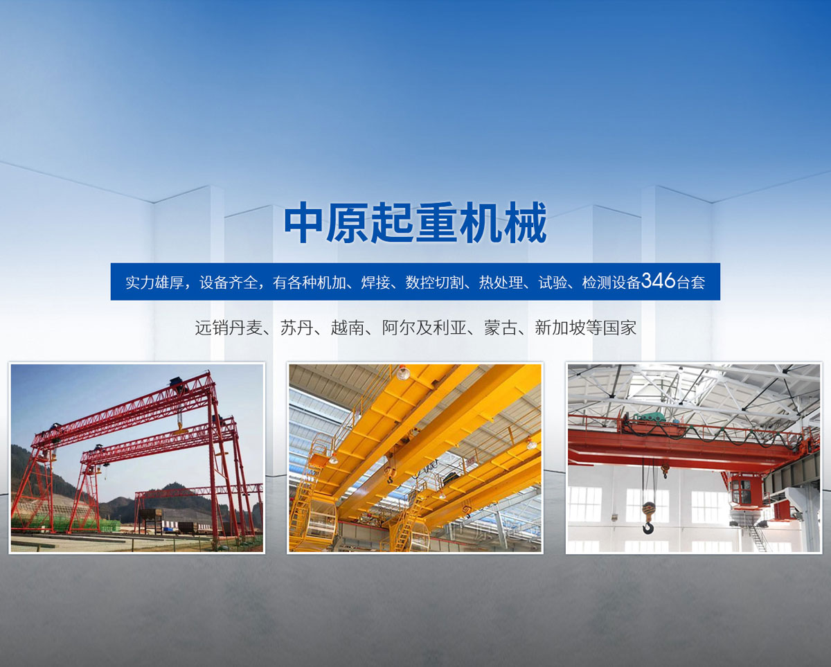 新鄉市中原起重機械有限公司成立于2000年,地處中原,輻射全國28個省市自治區,設外埠經銷處、辦事處268個。產品行銷工礦、建材、化工、冶金、電力、交通、鐵路、油田、港口等各個行業。遠銷丹麥、蘇丹、越南、阿爾及利亞、蒙古、新加坡等國家。  公司實力雄厚,設備齊全,有各種機加、焊接、數控切割、熱處理、試驗、檢測設備7臺;有機加工、熱處理、單、雙梁橋門機生產、檢測、安裝等9個車間,研究中心、運輸公司、安裝維修服務公司等機構,?  主要產品有:LD型1~20噸電動單梁起重機系列產品;5~600噸通用橋式、門式、冶金、上旋轉下旋轉電磁吊、絕緣、抓斗、防爆起重機系列產品;LH3~100噸葫蘆雙梁系列產品;MH5~32噸葫蘆門式系列產品;0.5~40噸CD1、MD1鋼絲繩電葫蘆系列產品;HS1型0.5~20噸手動葫蘆系列產品;0.5~10噸環鏈電動葫蘆系列;0.5~40噸彎道電動葫蘆系列產品;裝卸橋、造船門機、架橋機、鑄造吊和水電大噸位起重機系列產品?! 」窘⒘藦娪辛Φ馁|量保證體系和生產過程的質量控制系統,嚴格執行國家設計、生產標準,有嚴格的生產工藝過程和標準,嚴格的檢驗、檢測標準和手段。